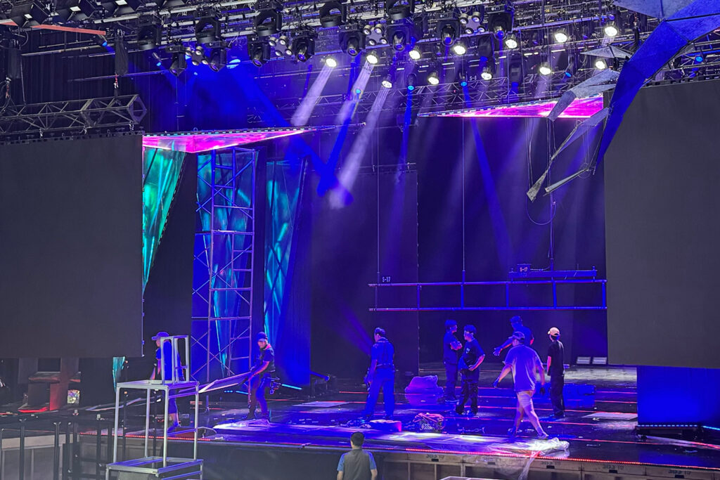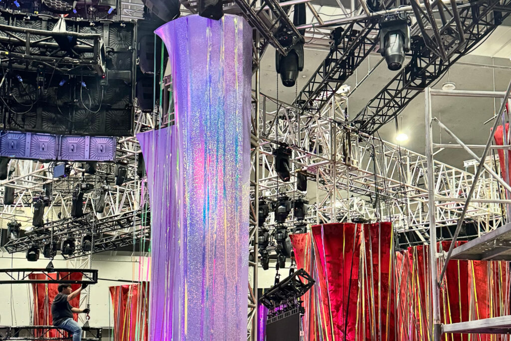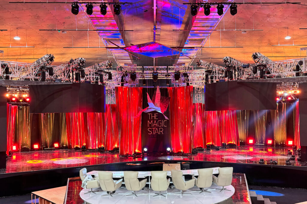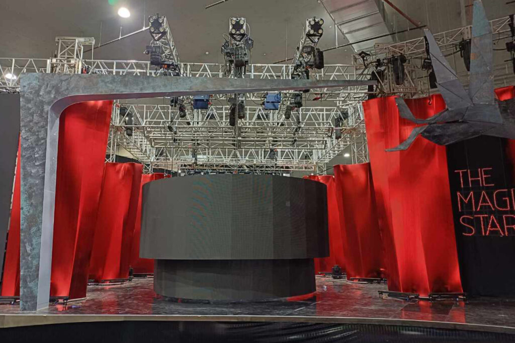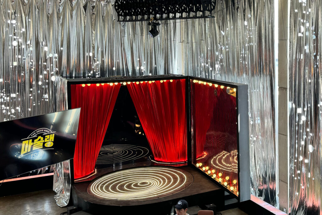 더매직스타 사전 인터뷰 무대 벽면 페브릭 조형물